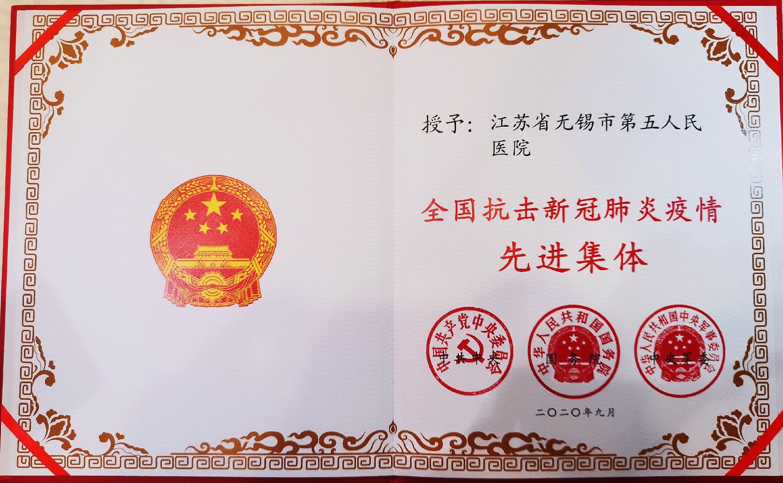 无锡五院党委书记、院长鲁晓杰代表医院在北京人民大会堂领取了由中共中央、国务院、中央军委联合表彰授予的“全国抗击新冠肺炎疫情先进集体”荣誉证书和奖牌!