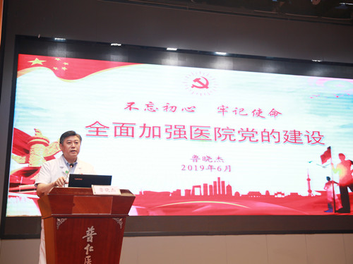 鲁晓杰同志以“不忘初心 牢记使命 加强医院党的建设”为题,为与会党员上了一堂生动的党课。他从共产党人应有的初心和使命谈起,对加强公立医院党的建设,贯彻落实党委领导下的院长负责制,它的背景、现实意义,如何把握其真正的精神要义,在实际工作中,党委应把准哪些职能定位,党员、干部应立足哪些转变,都进行了明确的阐述。鲁书记寄语广大党员干部,要以市委组织部和市卫健委“一引领四融合”行动方案为抓手,进一步增强“四个意识”,坚定“四个自信”,做到“两个维护”,强化基层党组织建设,时刻保持清醒的政治头脑,审时度势,与时俱进,学习新思想、融入新时代,积极投身医院的各项改革发展,解放思想,与时俱进,担当作为,为二院、五院再上新台阶,为普仁医疗集团的大发展而努力!