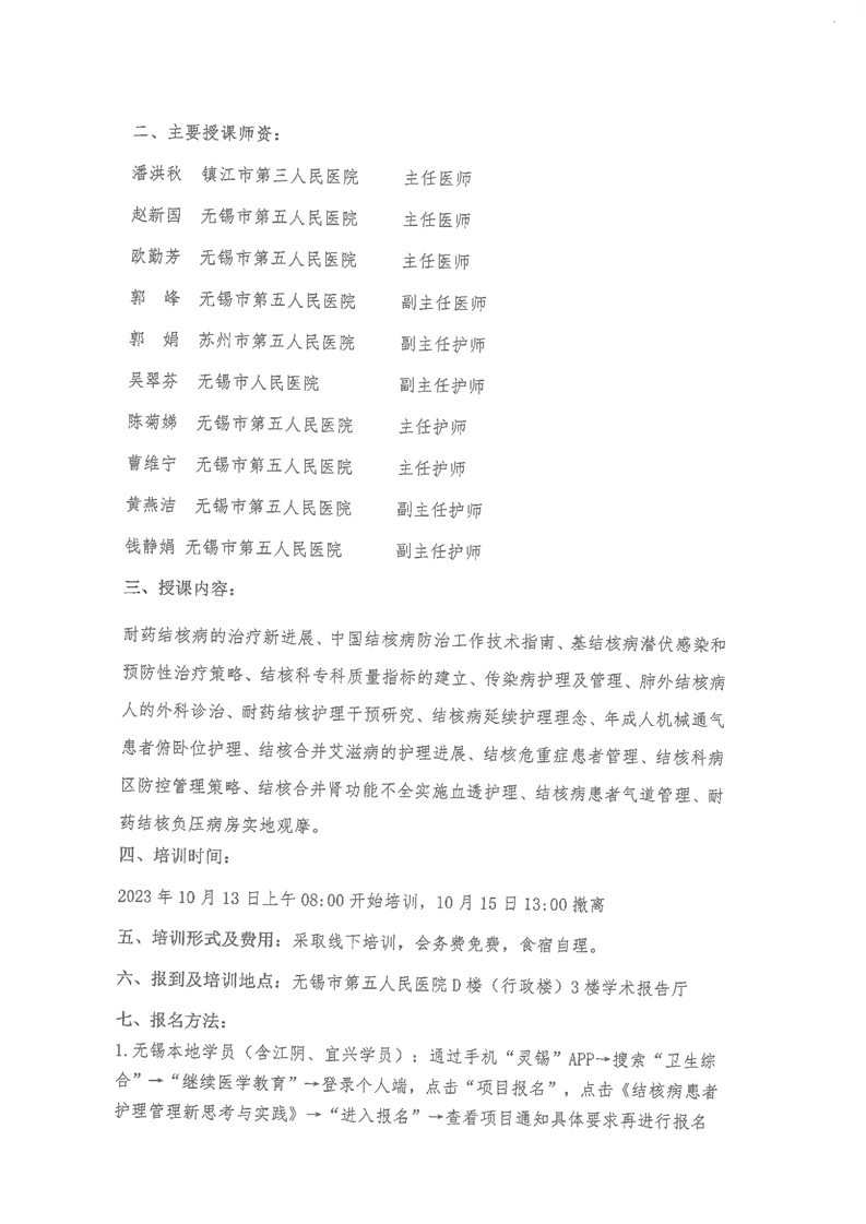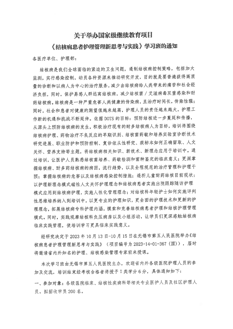 关于举办国家级继续教育项目《结核病患者护理管理新思考与实践》学习班的通知