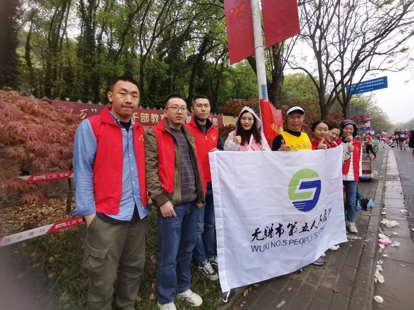 4月11日,樱花微雨,一年一度的无锡马拉松鸣枪开跑。一大清早,6点刚过,无锡市第五人民医院医技党支部的7名志愿者早早地来到赛道旁,为参赛选手加油打call,提供物资补给和医疗救助。他们一就位,立马投入工作,做着各种准备,医疗物资、运动饮料等一一摆开,以最便捷的方式迎接选手们的到来。