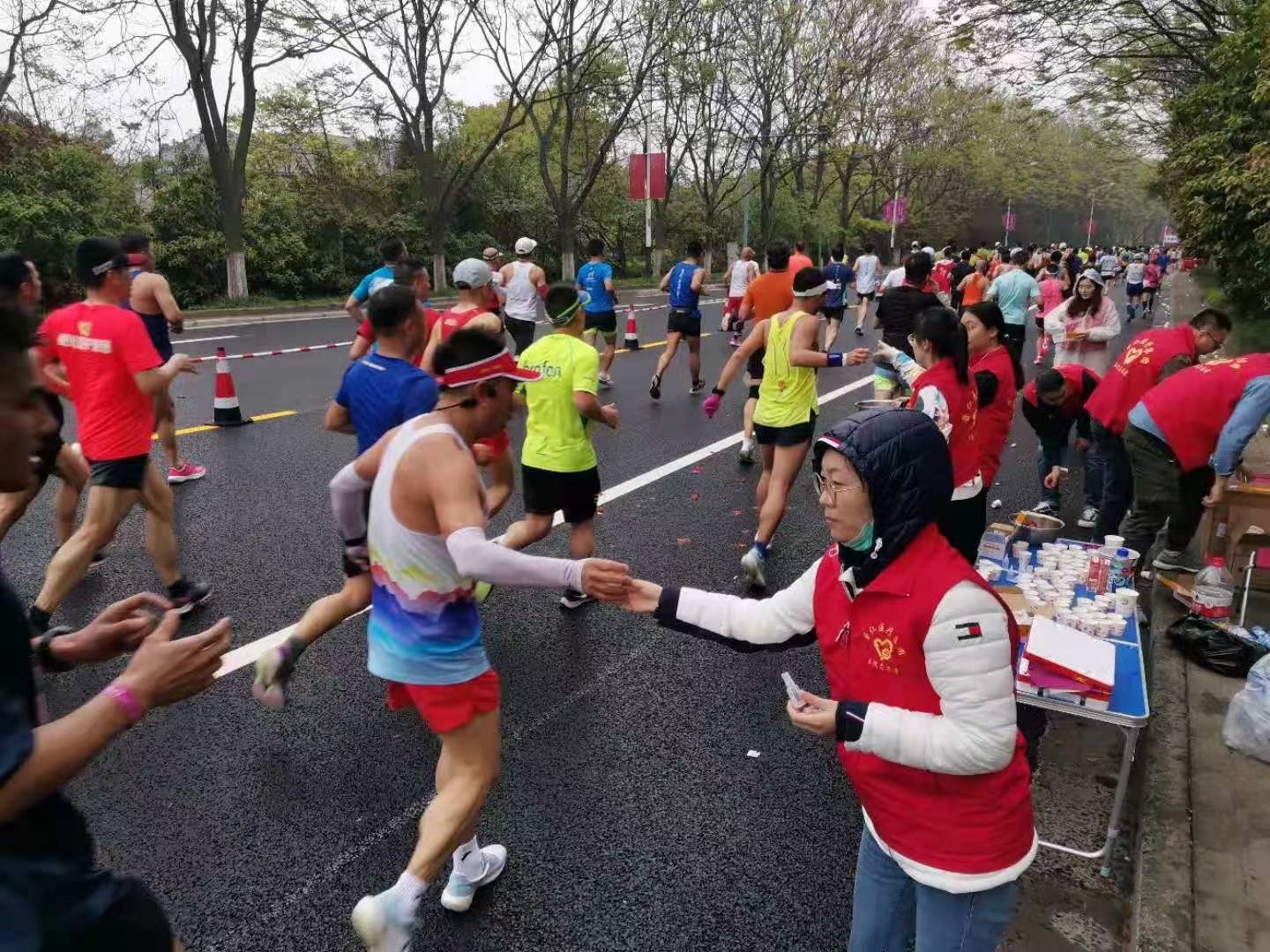 “我的小腿、膝盖处酸痛,需要处理。”15公里处,一位三十多岁的女选手请求帮助,志愿者李杰迅速到位,进行运动防护喷雾处理。“我抽筋了,动不了。”志愿者迅速为抽筋选手进行拉伸和按压处理。在一次次面对参赛选手需求时,志愿者们迅速响应,服务到位,保障每位参赛选手及时安全到达终点,选手们一句句“谢谢!你们辛苦了”是对志愿者们最美的回赠。当天虽然气温骤降,但是每一位志愿者始终坚守岗位,热情服务,用自己的汗水和微笑成为了无锡马拉松赛一张靓丽的名片。