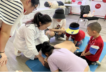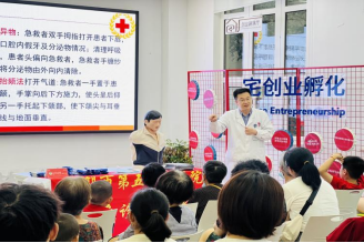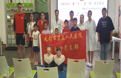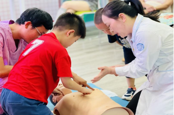 活动现场,急诊科主任、门急诊党支部书记许军首先就野外危险水域辨别、如何判断溺水、如何正确施救溺水人员三个方面进行阐述,重点强调预防溺水“六不”要求,并结合实例讲解如何预防溺水、遇险逃生、创伤自救等安全知识。随后,急诊科护士长杨芸、青号骨干王洪许以“理论学习+示范演练+实际操作”相结合的形式生动授课,通过现场参与的交互式、自助式学习与体验,带领社区青少年们学习了解心肺复苏的适用范围、具体内容和操作要领,以及气道异物梗阻解除的现场急救知识和技能,并现场演练徒手心肺复苏操作和海姆立克急救法,孩子们在培训老师的亲身示范和耐心教导下,认真学习,争相实践。