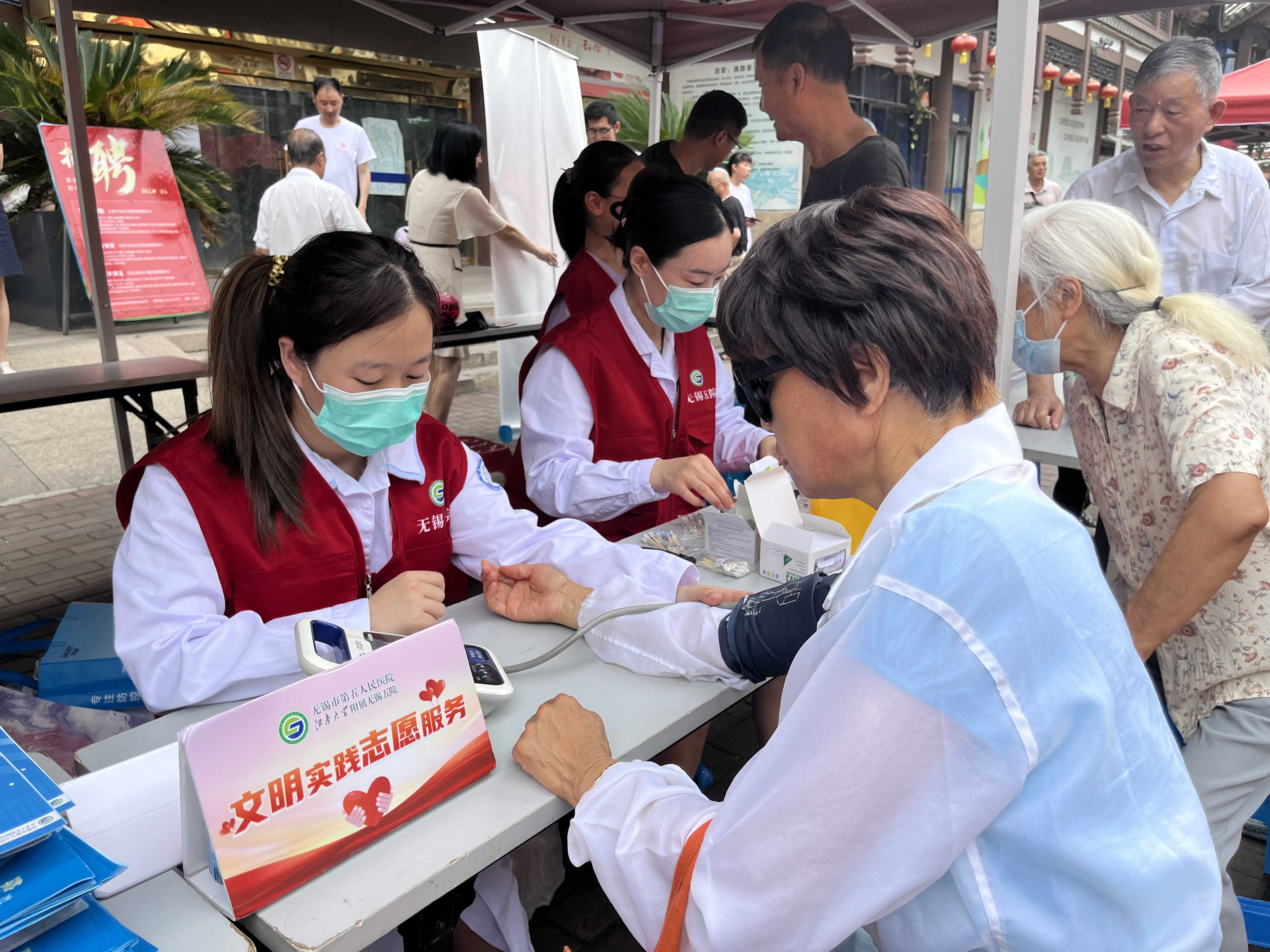 为进一步提高居民健康意识,守护锡城百姓健康,市五院“白衣微天使”志愿服务队不畏酷暑,来到南禅寺广场,为市民开展健康咨询惠民活动。医护志愿者耐心倾听市民群众的健康需求,通过现场查体、翻阅病历等方式,提供个性化的诊疗建议和生活指导,并向市民们发放健康知识宣传册。针对连日来的高温天气,志愿者有针对性地讲解中暑的症状及中暑后的处置,提醒大家预防和应对高温病症,减少户外活动时间,保证充足的睡眠,合理饮食,多喝水,引导居民树立夏季健康生活的理念,确保大家能够度过一个健康、安全的夏季。