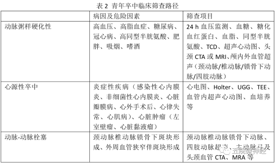 青年卒中应从心脏查起,临床筛查路径包括动脉粥样硬化性、心源性卒中及动脉-动脉栓塞,病因及危险因素详见表2。